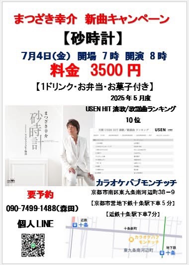 2025年6月18日 / 最終更新日時 : 2025年6月18日 カラオケパブモンチッチ カラオケ まつざき幸介 新曲キャンペーン 2025年5月度USEN HIT 演歌/歌謡曲ランキング10位人気急上昇中【砂時計】まつざき幸介まつざき幸介君がカラオケパブモンチッチにやって来ます今回は手作りのお弁当を用意致しますのでそれも楽しみに‼️席数に限りが有りますのでお早めに御予約お願い致します🙇 Follow me! FacebookX