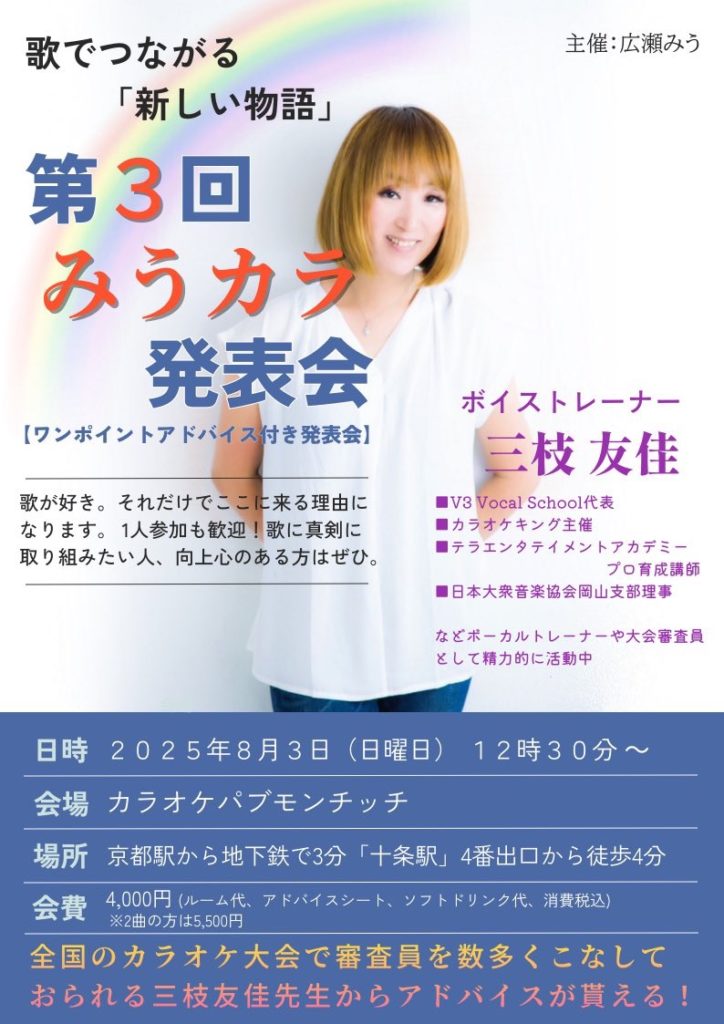 2025年8月13日 / 最終更新日時 : 2025年8月13日 カラオケパブモンチッチ 未分類 第三回みうカラ発表会 8月3日(日曜日)第3回みうカラ発表会満席御礼で大盛況な素晴らしいイベントとなりました🙇♂️岡山からボイストレーナーの #三枝友佳 先生をお招きして歌唱指導して頂きました🙇♂️ゲストとして #Ado と同じ声を持つ少女としてテレビのモノマネ番組で優勝されている #莉音 ちゃんがゲスト出演して歌って頂きました♪ #Ado #カラオケ喫茶 Follow me! FacebookX